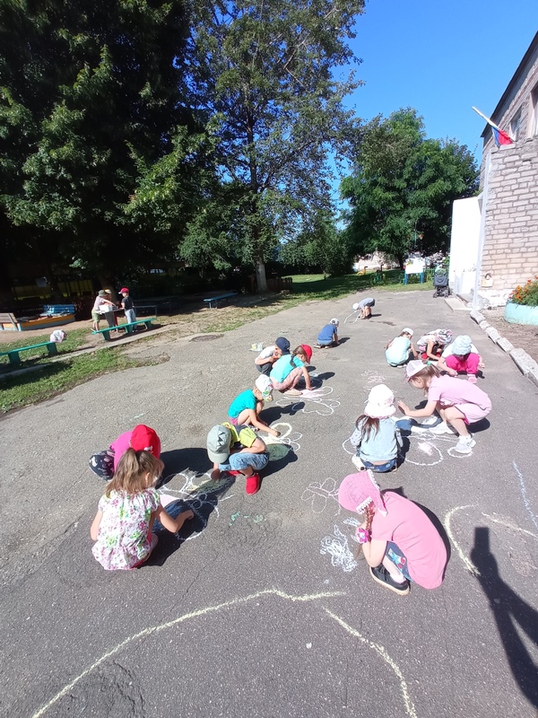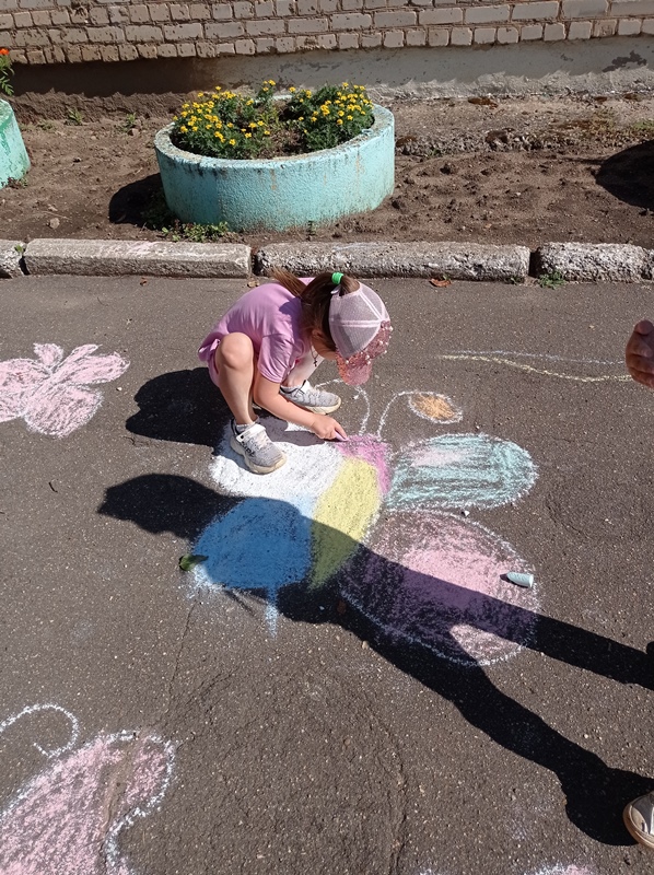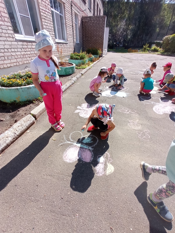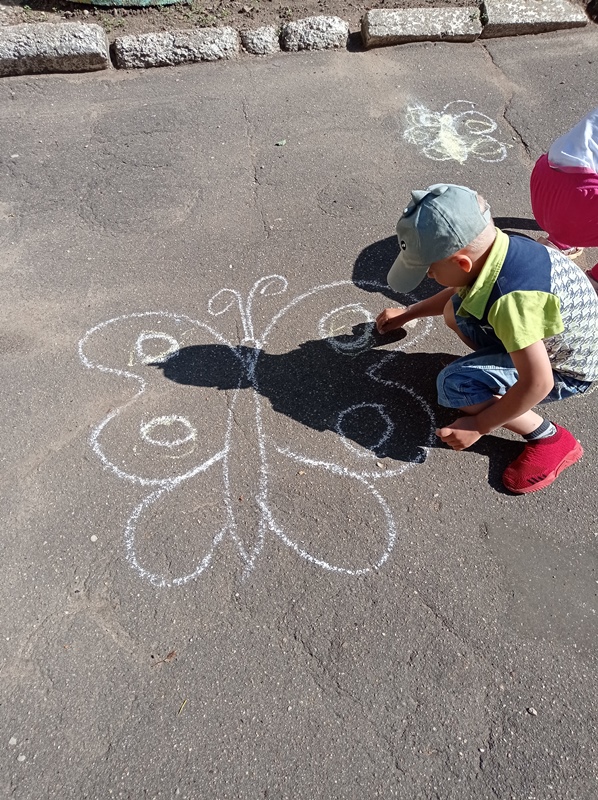Во время прогулки ребята наблюдали за насекомыми на клумбах, а так же дали свободу своему творчеству. Они с большим удовольствием рисовали на асфальте цветными мелками разных бабочек.